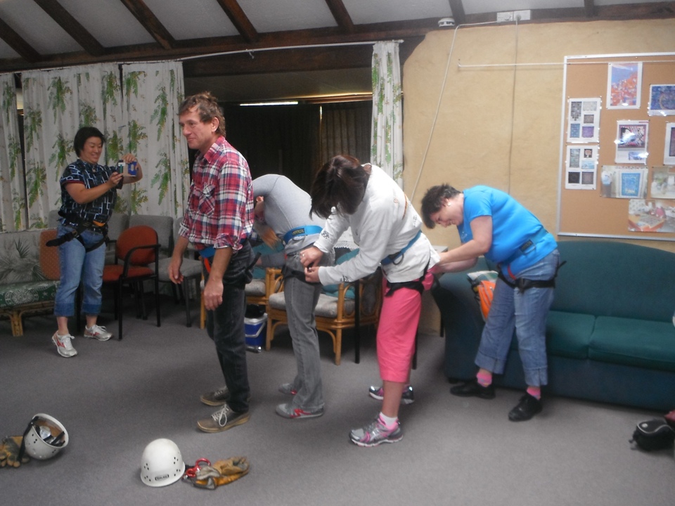Day 1 at WI-16. Emerging bleary eyed from last night's dancing, 13 eager adventurers attacked the first day of activities with aplomb. Doug was abseiling for the first time and discovered his heart rate monitor soared to 130 after each descent. Marcus found deep gouges in his boot soles after dropping in Crucifix position. They don't make 'em like they used to! Despite some tentative steps amongst the first timers, enthusiasm never waned and everyone came back up for more.
