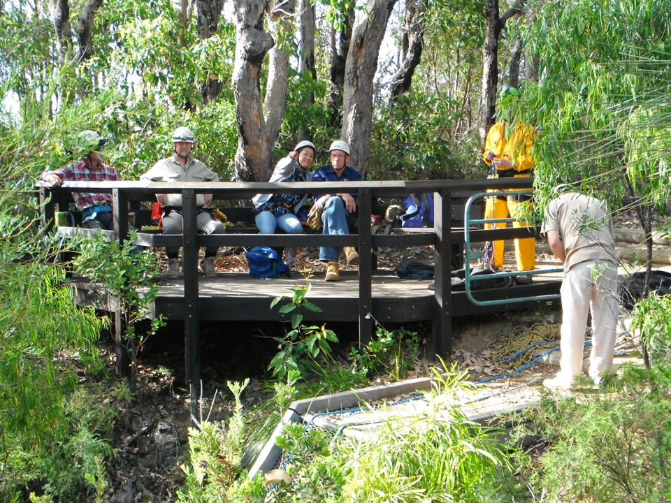 Day 1 at WI-16. Emerging bleary eyed from last night's dancing, 13 eager adventurers attacked the first day of activities with aplomb. Doug was abseiling for the first time and discovered his heart rate monitor soared to 130 after each descent. Marcus found deep gouges in his boot soles after dropping in Crucifix position. They don't make 'em like they used to! Despite some tentative steps amongst the first timers, enthusiasm never waned and everyone came back up for more.